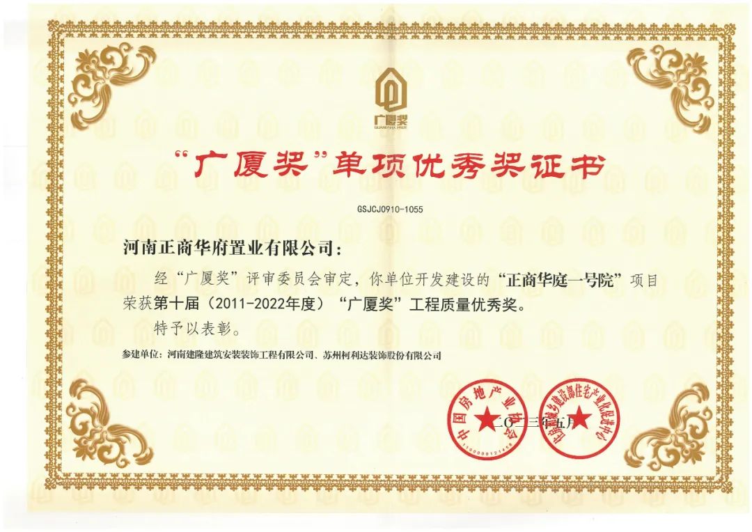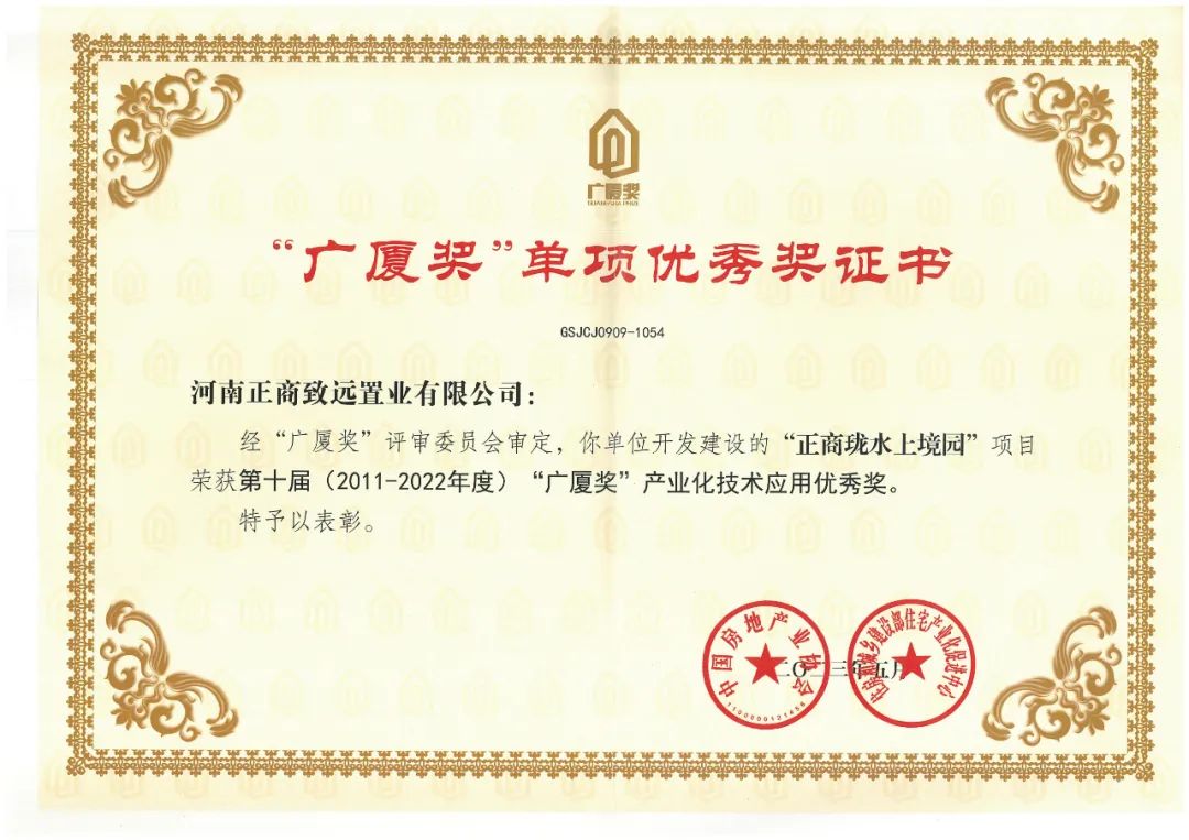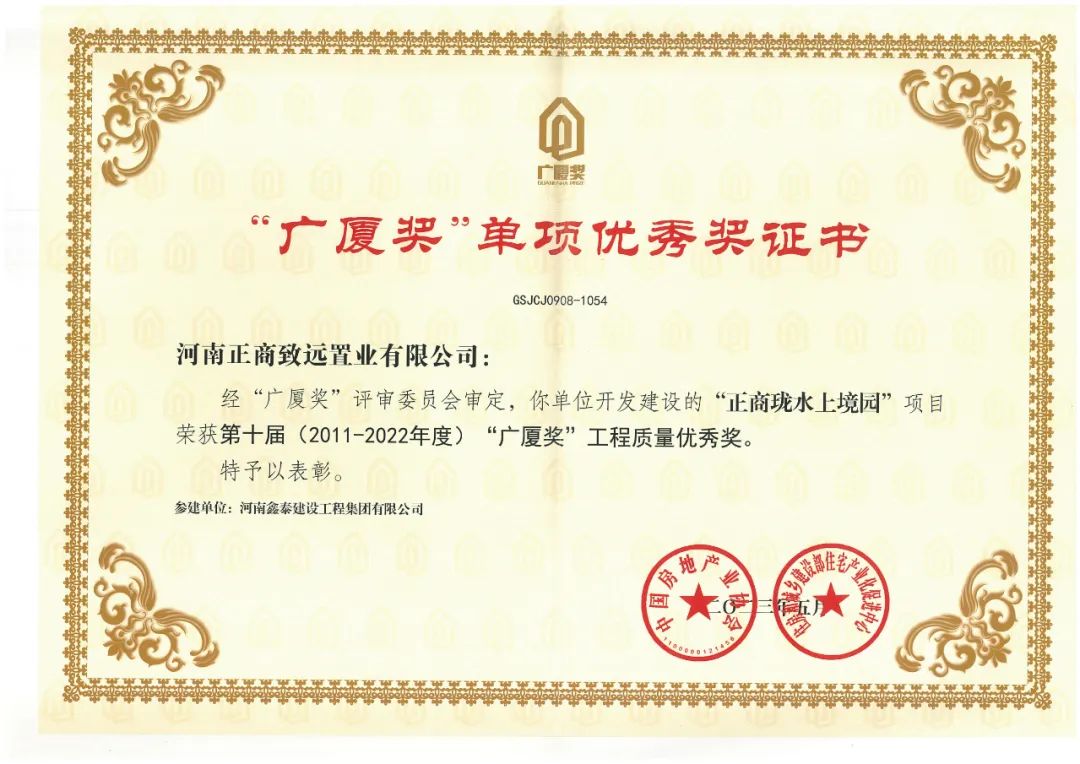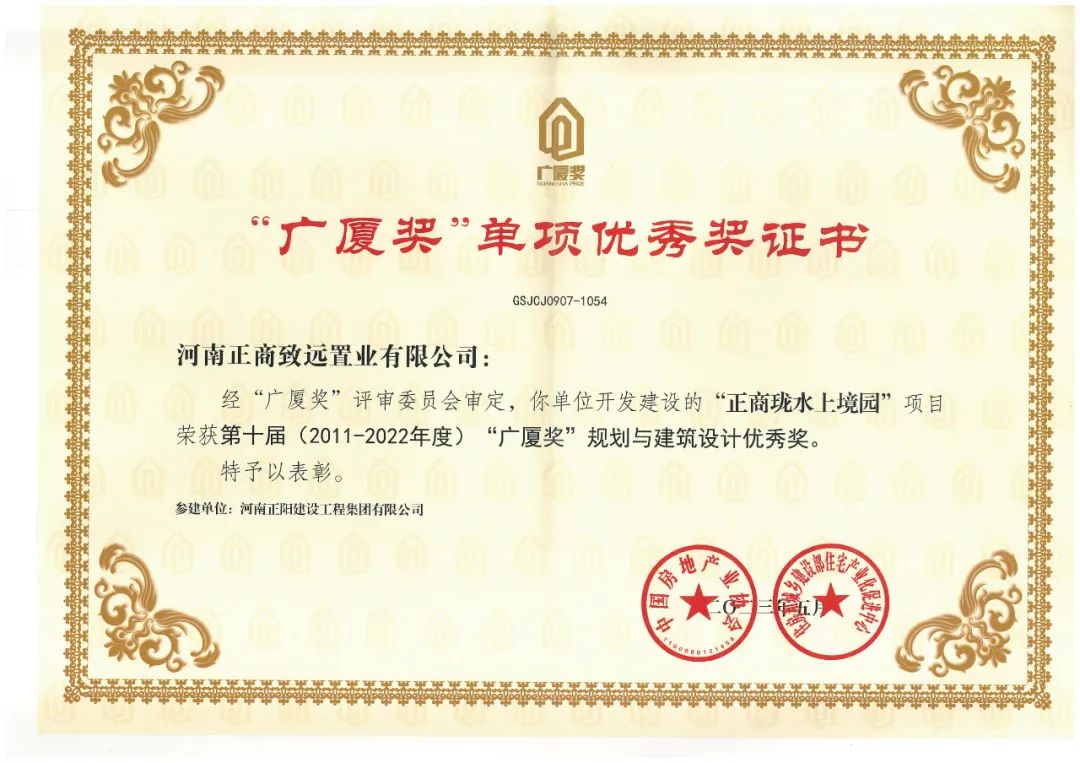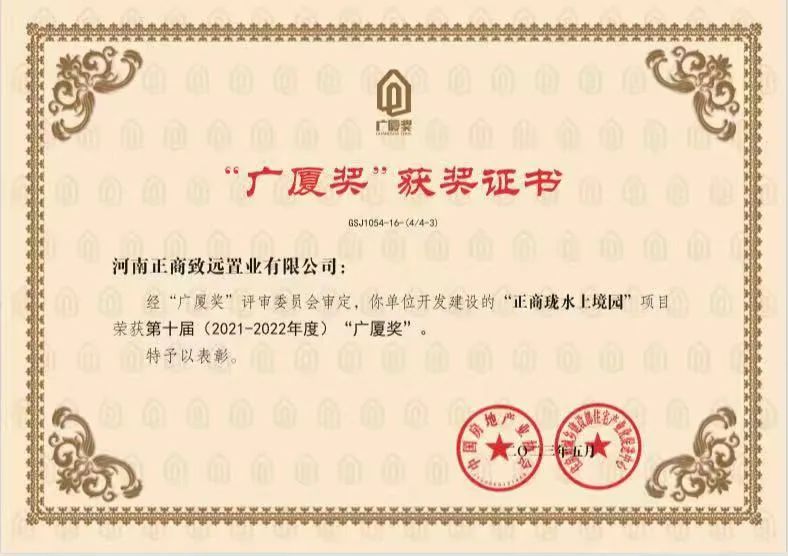 “广厦奖”是全国评比达标表彰工作小组批准的国家级奖项,由中国房地产业协会和住房和城乡建设部住宅产业化促进中心共同主办,每两年一届, 为中国房地产项目综合最高荣誉。(信息来源:正商集团)